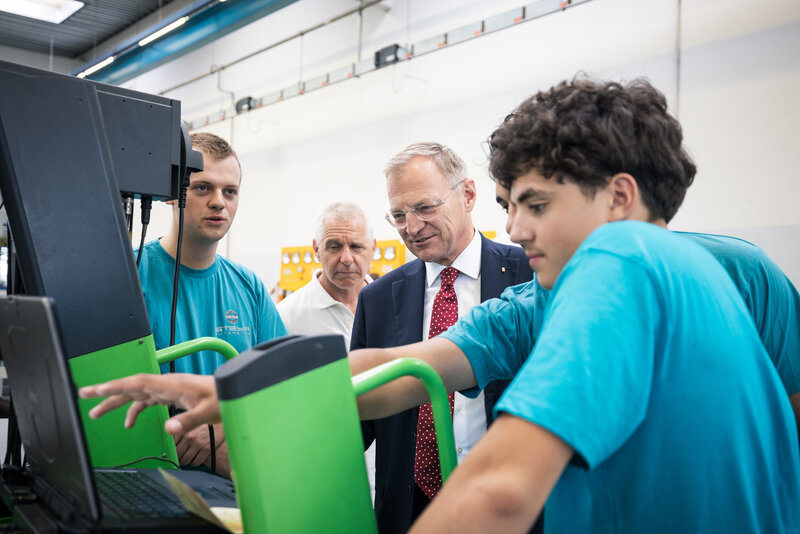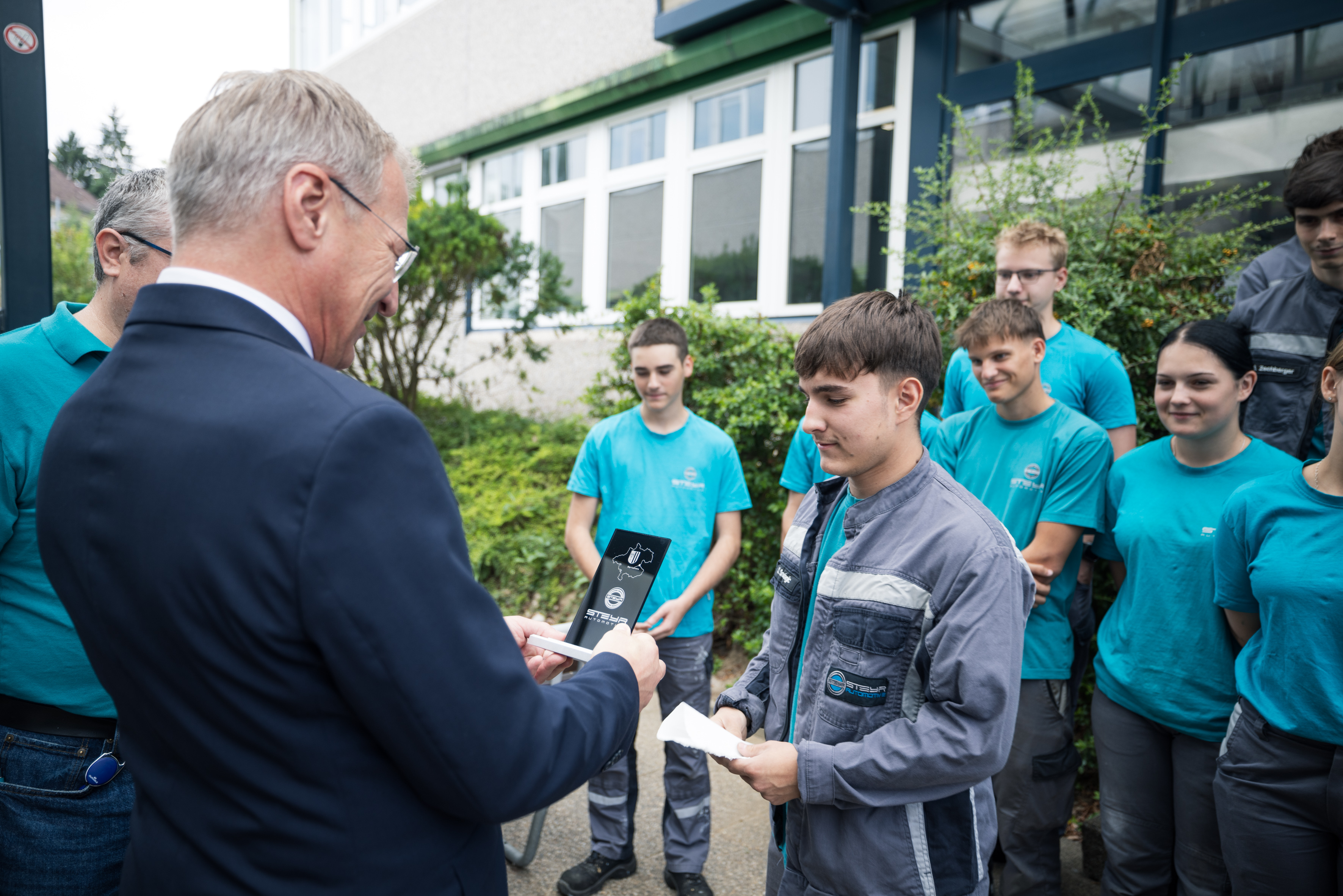 Ein zentrales Element für die Zukunft von Steyr Automotive ist die Ausbildung junger Fachkräfte. Aktuell bereitet das firmeneigene Ausbildungszentrum rund 130 Lehrlinge auf ihre Industriekarrieren vor. In der kommenden Woche startet der nächste Jahrgang ins Berufsleben. Zum Abschluss des Besuchs überreichten die Lehrlinge dem Landeshauptmann ein selbst konstruiertes und gefertigtes Geschenk – ein eindrucksvoller Beweis für das Können und die Kreativität des Nachwuchses.