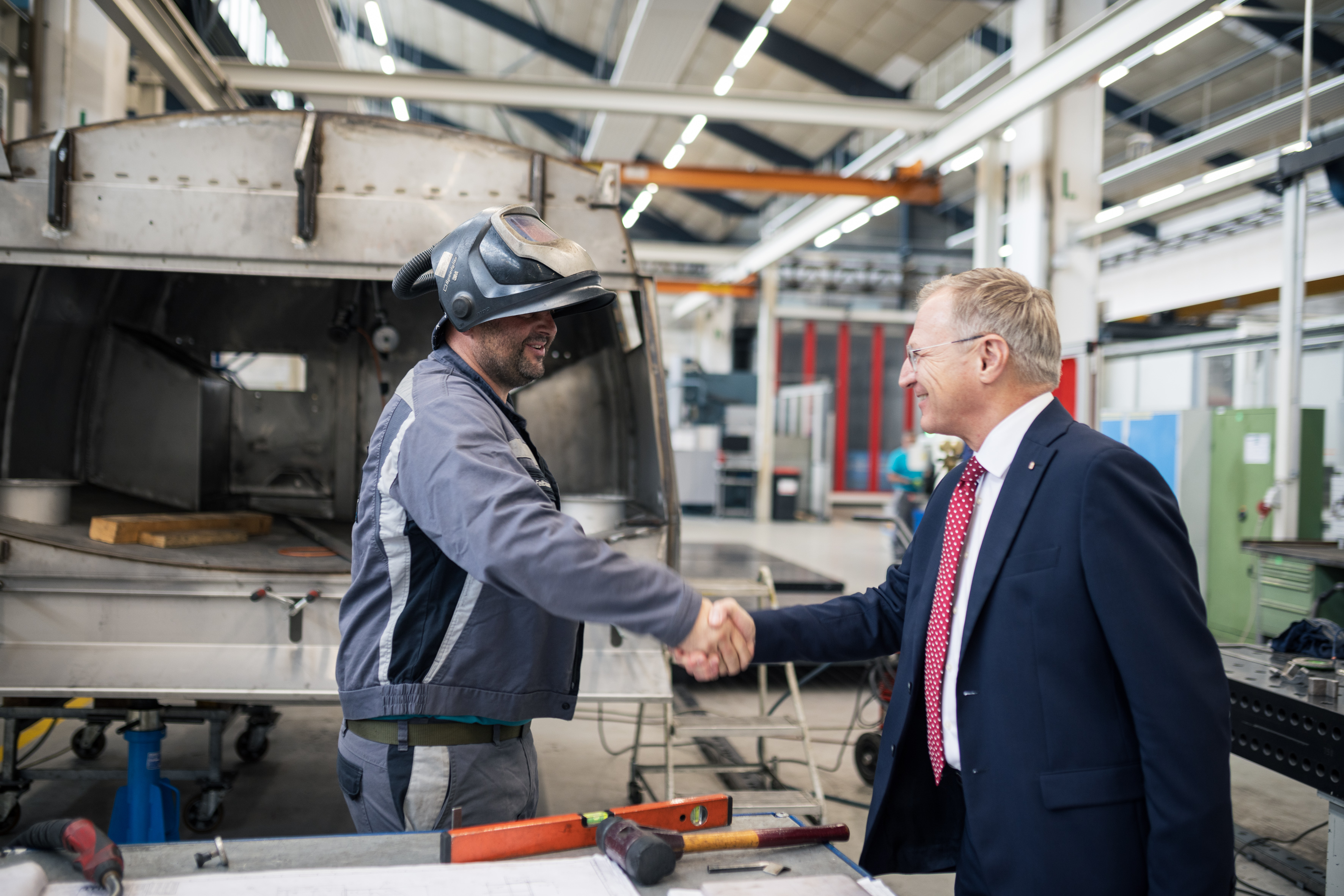 Im Rahmen eines intensiven Rundgangs erhielt der Landeshauptmann einen umfassenden Überblick über die vielfältigen Geschäftsbereiche von Steyr Automotive – von Aufbauten für Straßenreinigung und Abfallsammlung über die Lackierung von Kunststoff-, Carbon- und Metallteilen bis hin zum Karosserie- und Metallbau.